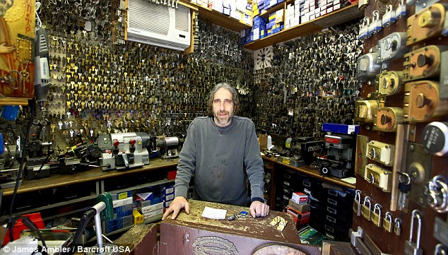 Work of art: Phil Mortillaro’s key cutting shop in Greenwich Village in New York. Ten thousand keys decorate the front of the shop in intricate spiral patterns.
