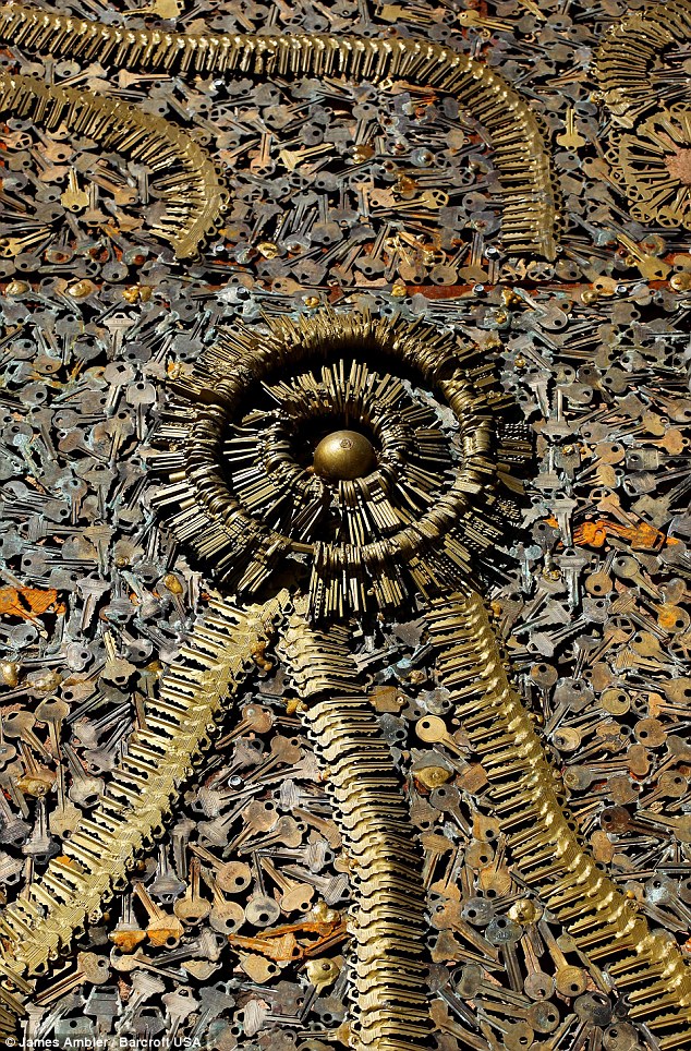 A locksmith has turned artist after decorating his shop front with 10,000 keys set in unusual and intricate patterns. Taking two years to weld and mould precise keys of all shapes and sizes onto the front panels of his New York store, owner Phil Mortillaro has made a tribute to the famously arty past of Greenwich Village.